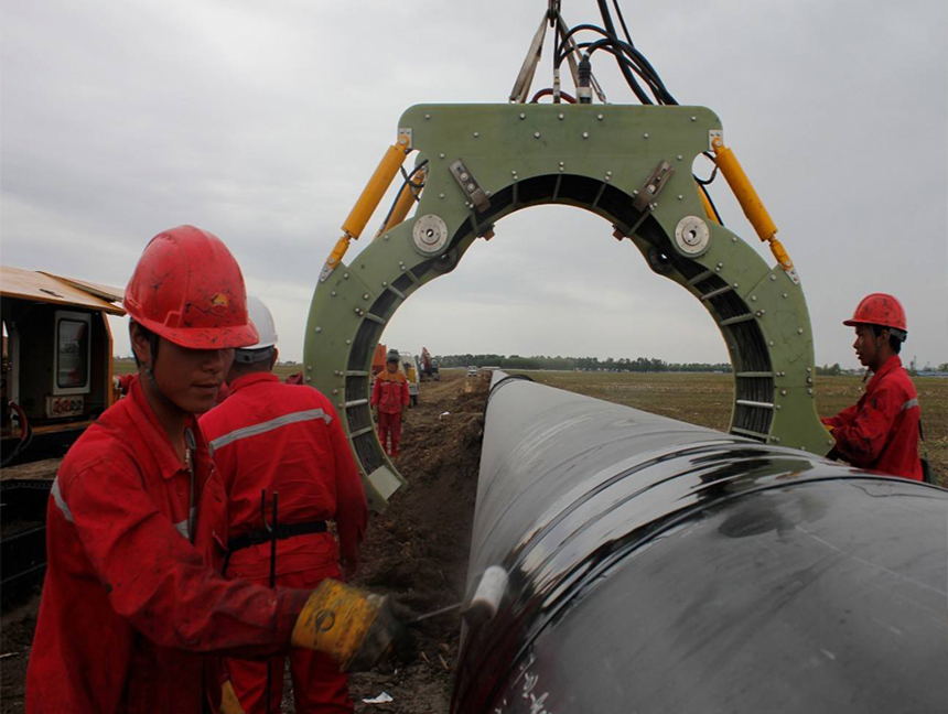 3、用烤槍(汽油噴燈)將待防腐段預(yù)熱至產(chǎn)品要求溫度,將熱縮套移至防腐段,用木楔等物支撐,盡量使套與鋼管同心。注意熱縮套與鋼管預(yù)制防腐層搭接應(yīng)不小于50m,